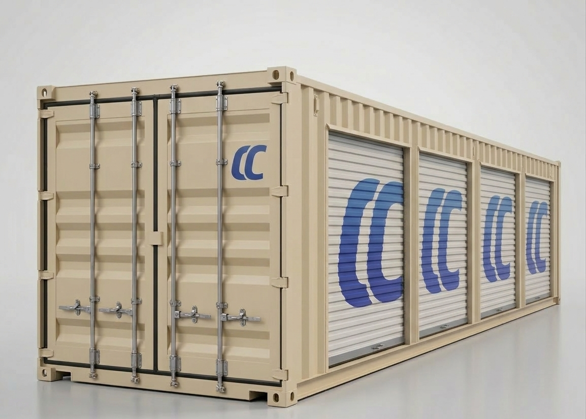 40ft New Storage Container w/ Four 8ft Roll-up Doors on Left Side.